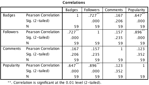 Pearson rank correlation test between badge total, follower total, popularity rank, and comment rank were conducted:
