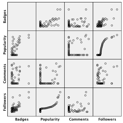 Since I do not currently have access to temporal data, this analysis will not seek to further elaborate on Jakob’s analysis. In this article I will seek to understand the relationships between important Hubski user variables, in order to understand whether the current rating system adequately represents (and advertises) the “most thoughtful” contributors on the website. This will be done by aggregating data on total number of badges, total number of followers, overall popularity rank, and overall comment popularity rank. Data were collected on January 7th, 2013 between 12:01 A.M. EST – 12:23 A.M. EST) from hubski.com/community. Data collected was publicly available, and permission to run this analysis was given by both mk and thenewgreen. Significance of the relationship between badge total, follower total, popularity rank, and comment rank were calculated using Pearson rank correlation and run on SPSS (Statistical Package for the Social Sciences). Data were also graphed using a simple scatter plot and a scatter plot matrix. These graphs were also constructed using SPSS.