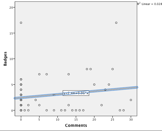 Below: two specific examples of Hubski data: Figure 3 represents not significant relationship between badge total and comment popularity; Figure 4 represents significant relationship between badge total and number of followers:
