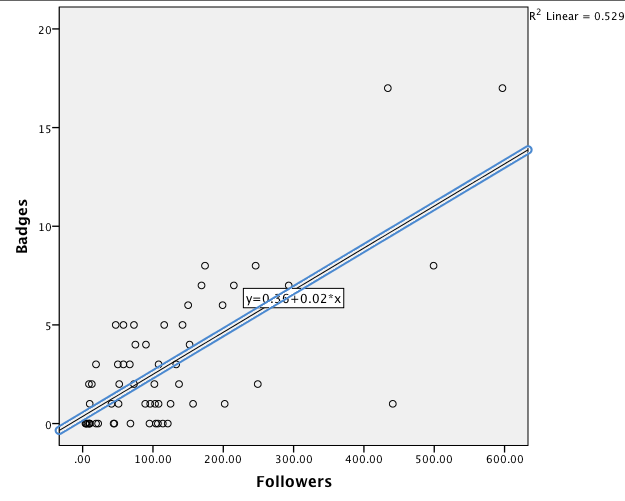 Badge total was significantly related to follower total (Pearson: n = 59, P = .000) and overall popularity rank (Pearson: n = 59, P = .000). This was true cross-directionallyand between follower and popularity rank (Pearson: n = 59, P = .000) (Fig. 1, 2).