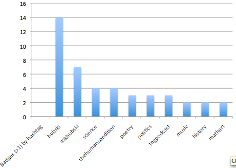 There were also a distribution of badged posts by hashtag. #hubski had the most with 14, #askhubski had had the second most with 7, #science and #thehumancondition had 4, #poetry, #politics, #tngpodcast had 3, and #music, #history, #mathart had 2. Hashtags with only 1 badge are not shown (Fig. 4). Figure 5 represents these data in word cloud.