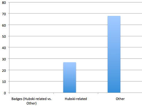 In this article I will attempt to better understand what Hubski has traditionally deemed “badge-worthy” in order to gain insight into the types of content users of Hubski find thoughtful. These data should help us gain perspective on the current comment rank system, but will also be useful in understanding other past trends, most importantly: what does the thoughtful social network think is thoughtful? This will be done by aggregating data on total number of badges, badges for posts vs. comments, badges by hashtag, badges for external vs. internal posts, and badges by comments <250 words vs. comments >250 words. Data were collected on January 12th, 2013 between 12:01 A.M. EST – 11:30 A.M. EST) from hubski.com/badgesubs. Data collected were publicly available, and notification of this studies progress was given to mk. Data were charted using excel and generated into a word cloud using wordle.net. Significance between badges for Hubski-related posts vs. other posts were tested using Wilcoxon-signed rank test and run on SPSS (Statistical Package for the Social Sciences).