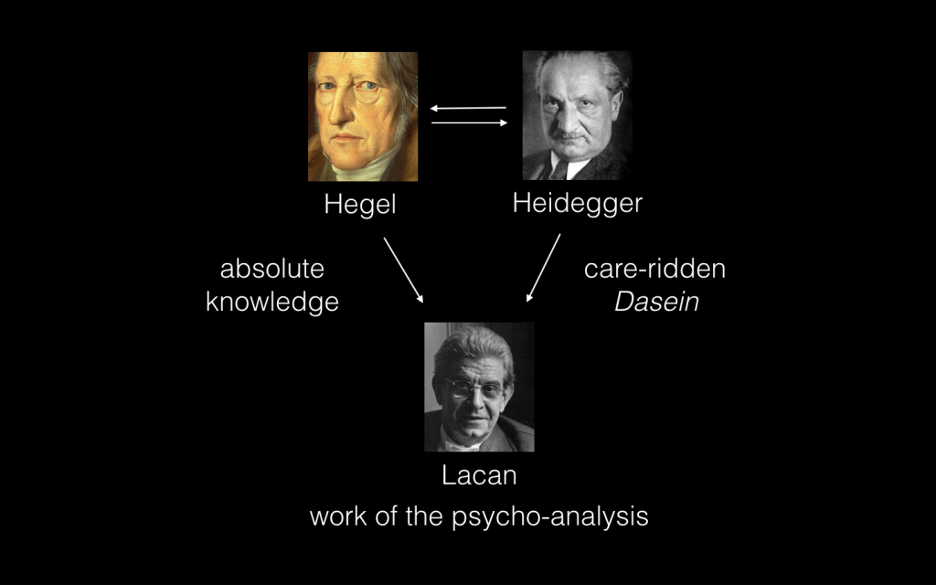 Lacan saw this lofty goal as somehow a weird synthesis between Hegelian “Absolute Knowledge” and Heideggerian “care-ridden” Dasein. Absolute Knowledge, as we have covered in Part 4 of Chapter 6, is Hegel’s name for the spirits own self-realization as a process that has no background or standard by which to measure its success or understanding outside of its own internal self-limitation. Heidegger’s Dasein, as we have not covered, is the notion that our being in the world is irreducibly bound up with a disposition of care for others. Lacan’s basic claim here is that an analysis should bring the subject to both its own absolute knowing and Dasein’s care-ridden state (“satisfaction achievable in the satisfaction of all”). The work of psychoanalysis then, for Lacan, is the higher order social emergence of what was discovered in the deepest philosophical forms.