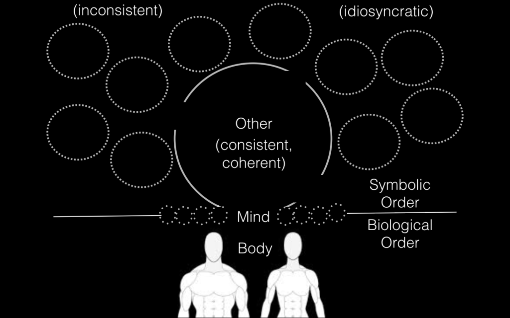 This is all important to understand the structure of a Lacanian psychoanalysis. In a Lacanian psychoanalysis we have the biological body of the subject, the inconsistent and contradictory mind of the subject, and the other as the empty-void point, occupied by analyst receptive to the frustrated speech of the subject.