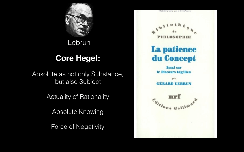 Žižek points towards Gerard Lebrun’s The Patience of the Concept to help us once again think the foundational core of Hegel. Here we find the absolute as not only substance but also subject; the actuality of the rational; the status of absolute knowing as self-limit; and finally, the force of negativity. Here the separated cause and the place of the unconscious can be situated in-between substance and subject, as what undermines the actuality of the rational, the precondition for the necessity of absolute knowing, and ultimately the mysterious location of the power of the negative force.