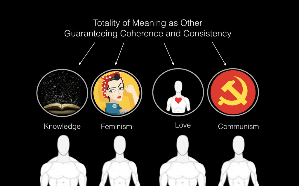 This brings us to the all-important axiom of Less Than Nothing that there is a non-Other that takes the location of the positivized images of the Other as a Totality of Meaning. The Totality of Meaning can only be discovered by confronting the non-Other of Death itself. In relation to this non-Other of Death there is a possibility to embed in one’s subjectivity a process of coherencing and consistencing (as opposed to a total system of coherence and consistence), but in order to guarantee its truth, one must always be in touch with death, with loss, with failure, with the end of one’s identity.