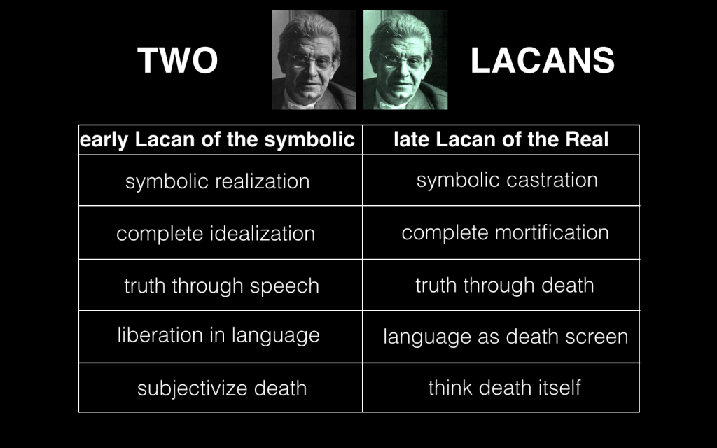“Lacan’s limitation is clearly discernible in how, in his last decades, he tends to oscillate between two poles which are both “worse”, as Stalin would have put it. Sometimes (exemplarily in his reading of Antigone), he conceives of the ethical act as a kind of “forcing”, a violent act of transgression which cuts into imaginary and symbolic semblances and makes the subject confront the terrifying Real in its blinding destructive power — such traumatic encounters, such penetrations into the forbidden and damned domain […] can only be sustained for a brief moment. These authentic moments are rare; one can only survive them if one soon returns to the safe domain of semblances — truth is too painful to be sustained for more than a passing moment. At other times […] Lacan adopts the opposite (but effectively complementary) attitude of wisdom: the analyst never knows what will happen when he pushes analysis too far and dissolves the analysand’s symptoms too radically — one can get more than one expected, a local interpretive intervention into a particular symptomal formation can destabilize the subject’s entire symbolic economy and bring about a catastrophic disintegration of his world. The analyst should thus remain modest and respect appearances without taking them too seriously; they are ultimately all we have, all that stands between us and the catastrophe. It is easy to see how these two stances complement each other: they rely on a (rather Heideggerian) image of human life as a continuous dwelling in “inauthentic” semblances, interrupted from time to time by violent encounters with the Real.”