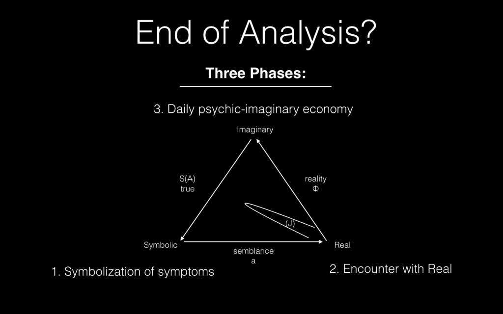 How can this real possibly be inscribed into a psychoanalysis? Here we attempt to image the Lacanian triad of the symbolic-imaginary-real with the methodological approach used by Lacan. The first step in an analysis is the “symbolization of symptoms” (expressing the real in frustrated, depressed, anxious speech); the second step is for the analyst to (gently, indirectly) bring the subject to encounter its own real directly, through, but ultimately, without symbolization; and third, it is the analysts job to help the subject piece together their imaginary self-notion back into the daily psychic “economy”.